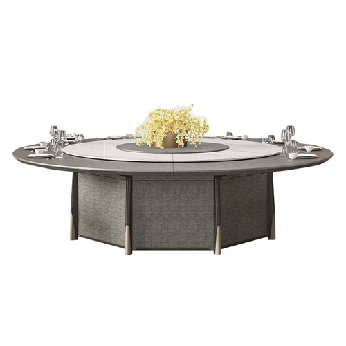 片尺寸价格说明定做服务。新中式轻奢岩板电动餐桌是一款适合酒店私人会所的高端餐桌,它采用了优质的岩板材料,具有耐磨、耐高温、易清洁的特点。餐桌的中心设有电动转盘,可以方便地调节食物的位置,让客人享受美食的同时,也感受到轻松愉悦的氛围。餐桌的设计风格是新中式,融合了传统和现代的元素,展现了简约而不失大气的美感。